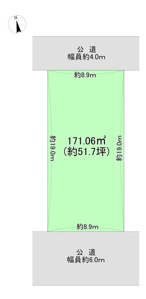 | 接道状況 | 北側公道約4mに約8.9m、 南側公道約6mに約7.4m接道 |